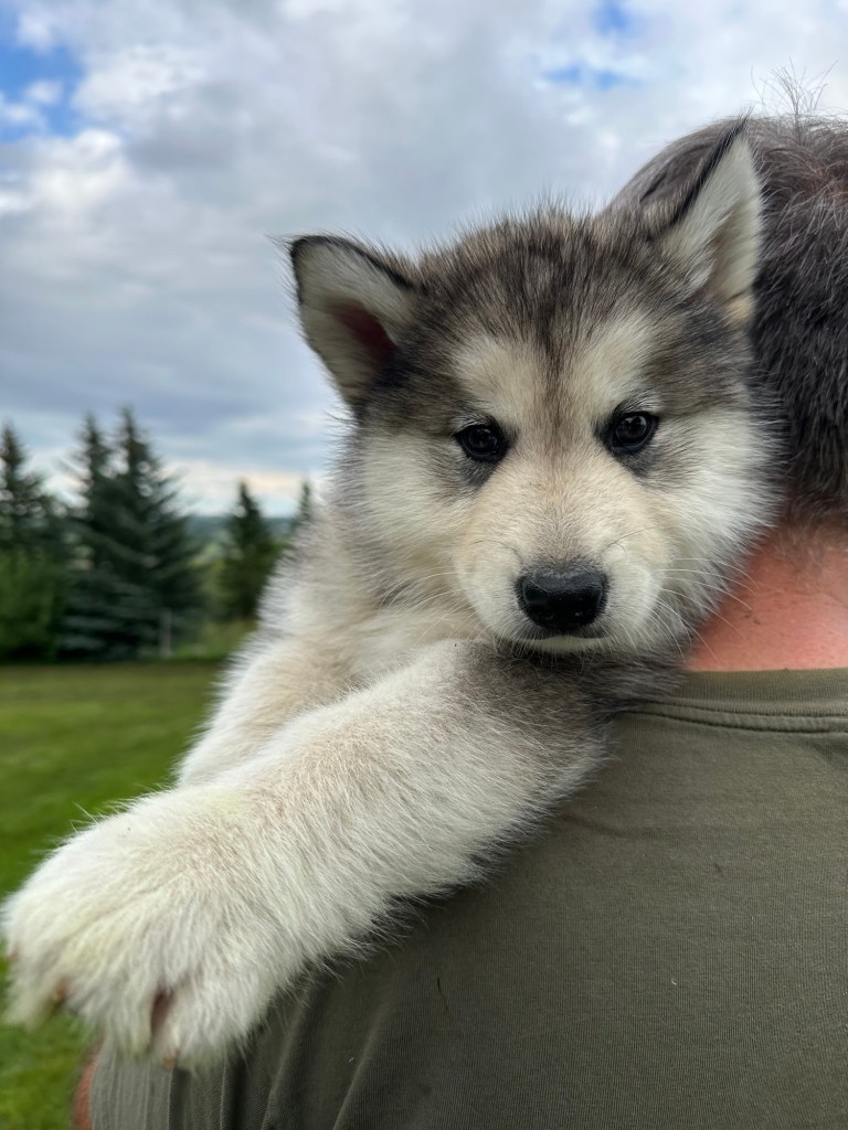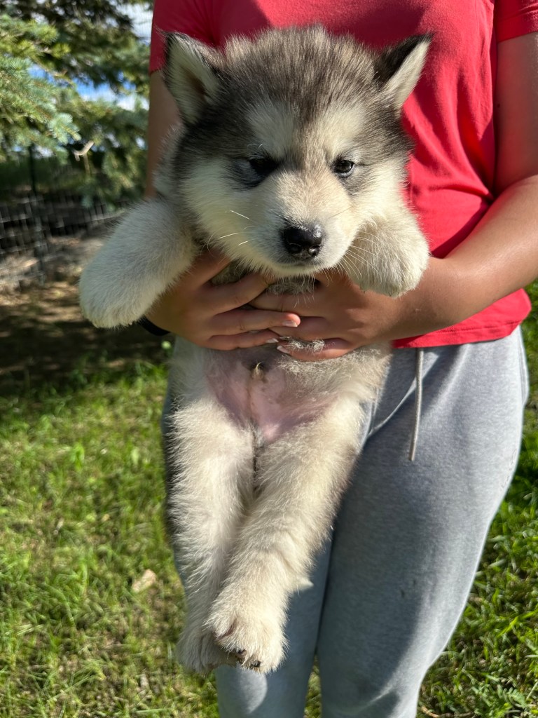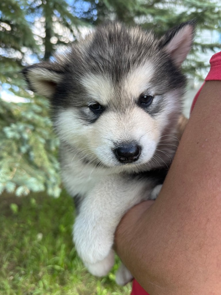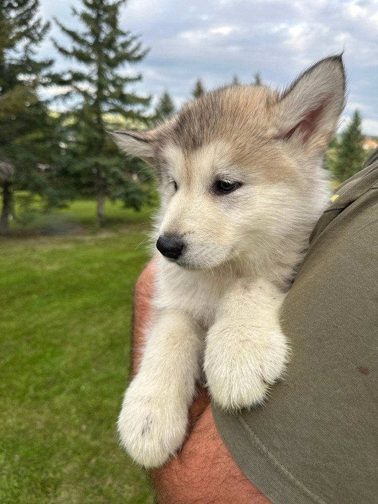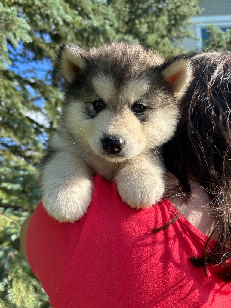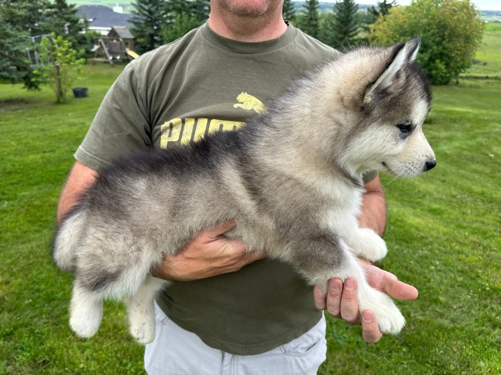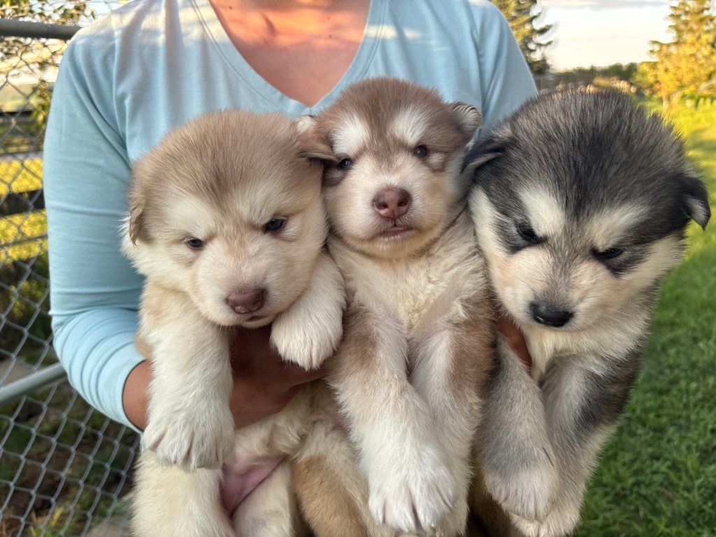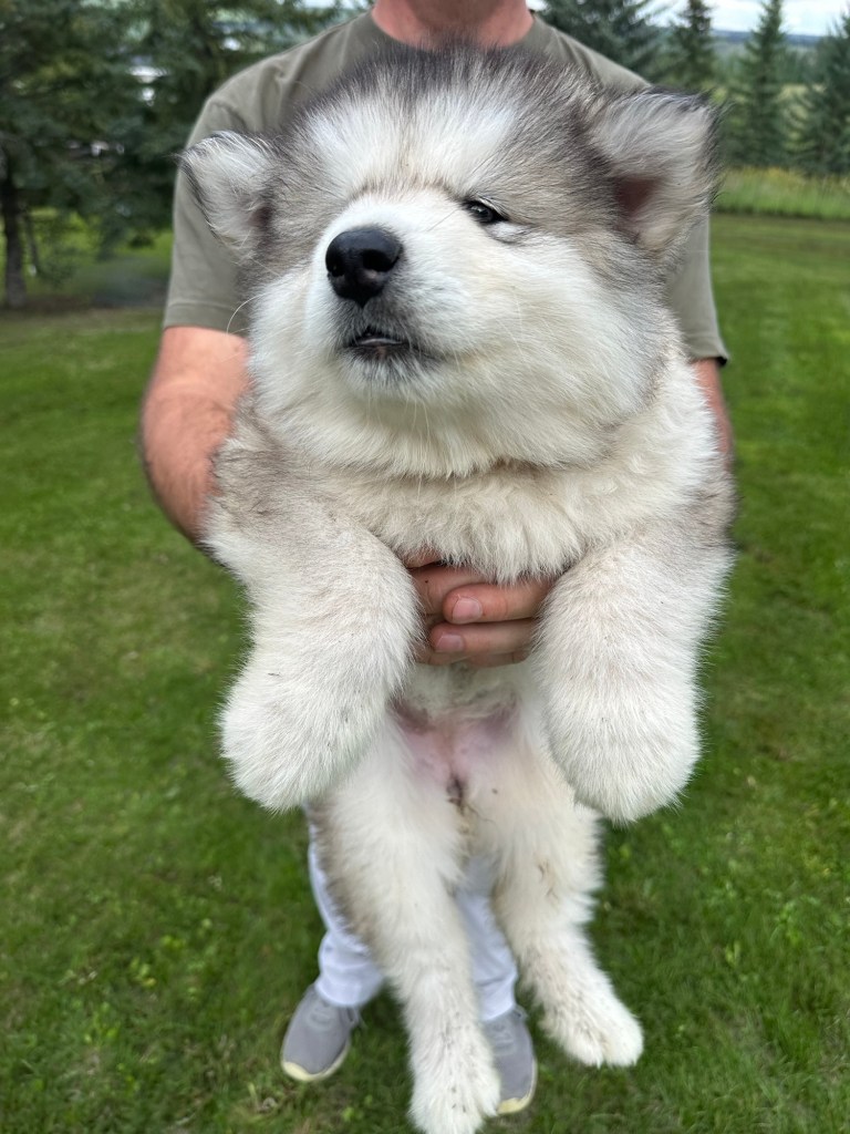 It’s been quite wet and rainy in Calgary so our latest batch of growth photos was slightly delayed. Our Alaskan Malamute puppies are now 5.5 weeks old, and they’re full of life! At this stage, they’re becoming more independent, engaging in play, exploring their environment, and interacting more with people. Their unique personalities are really shining through and they are so much fun to watch and play with! With one selection still pending there are only two puppies remaining from this litter. If you’d like to bring one home contact us today!