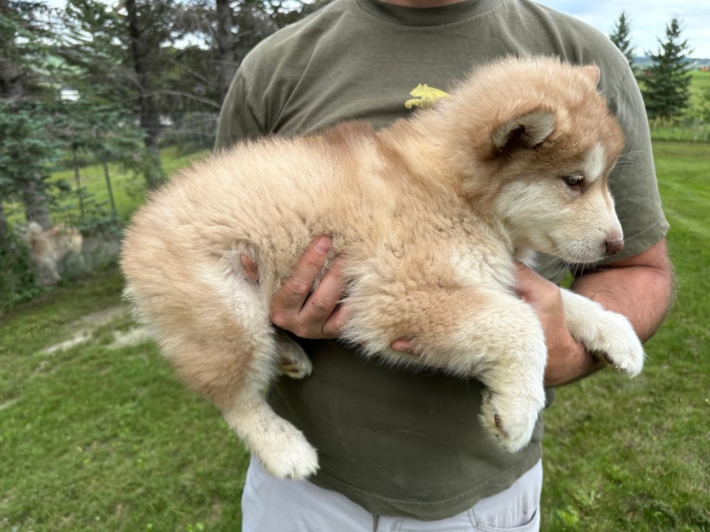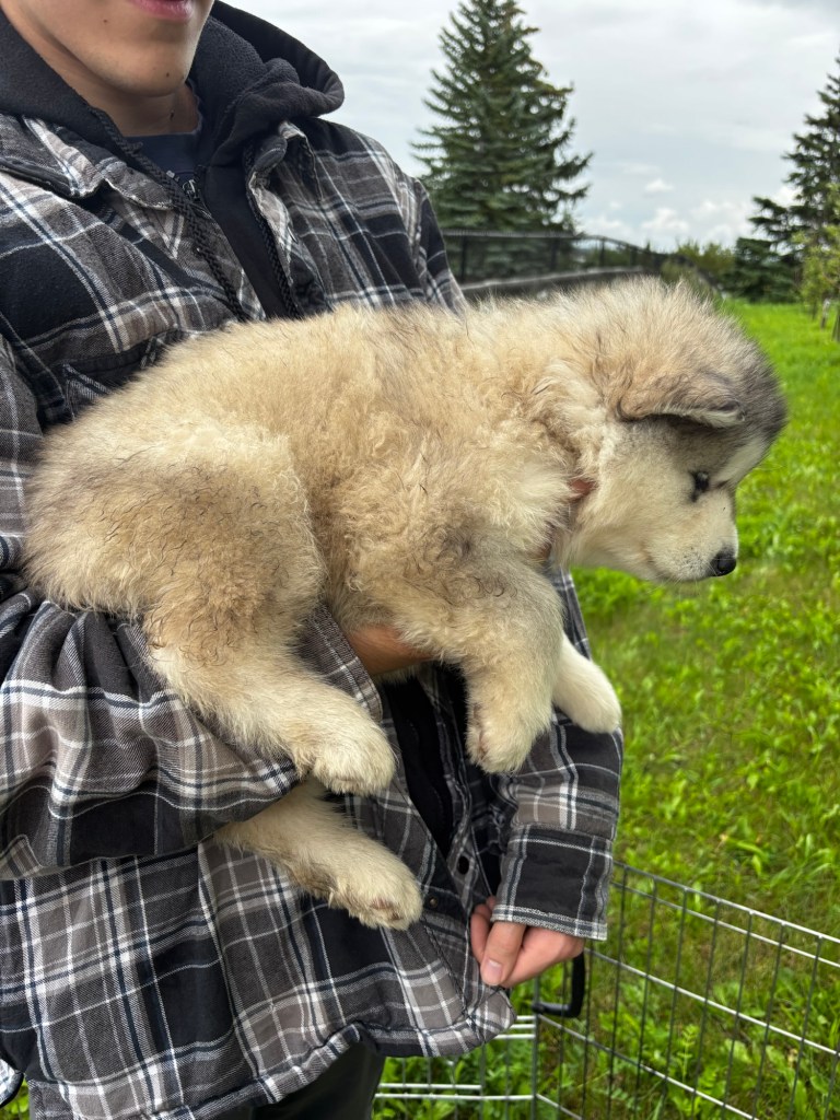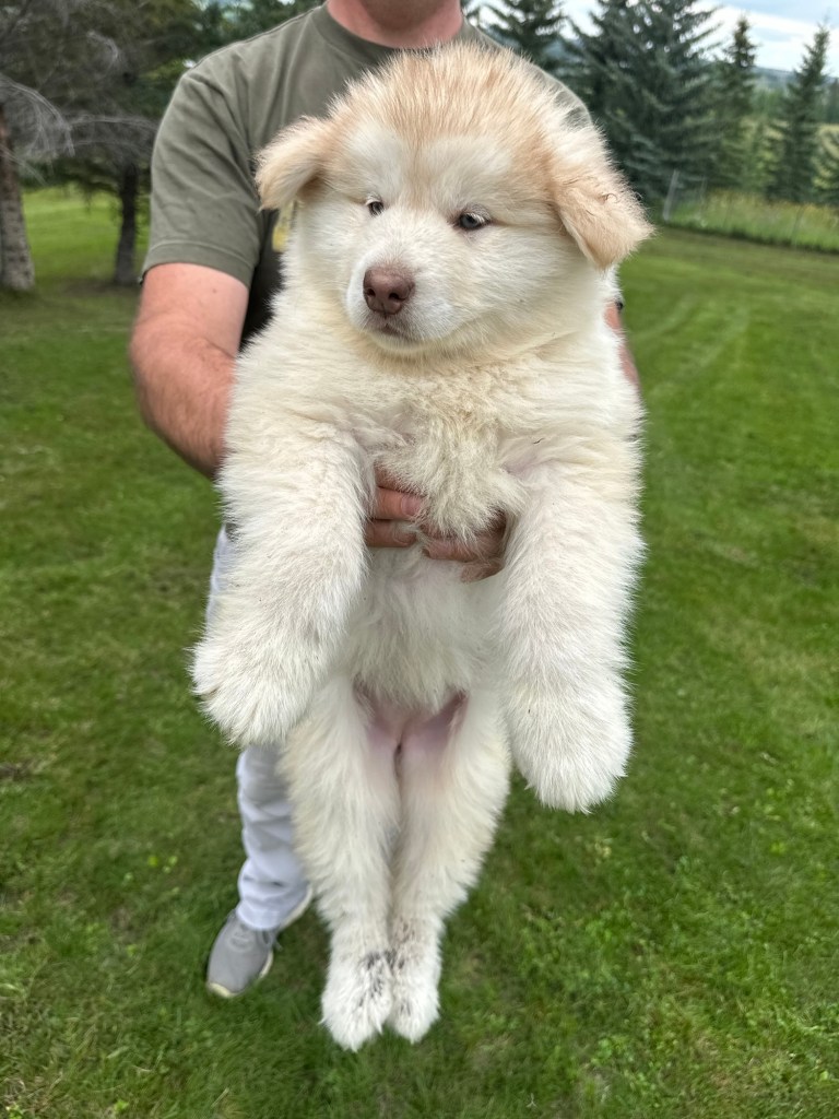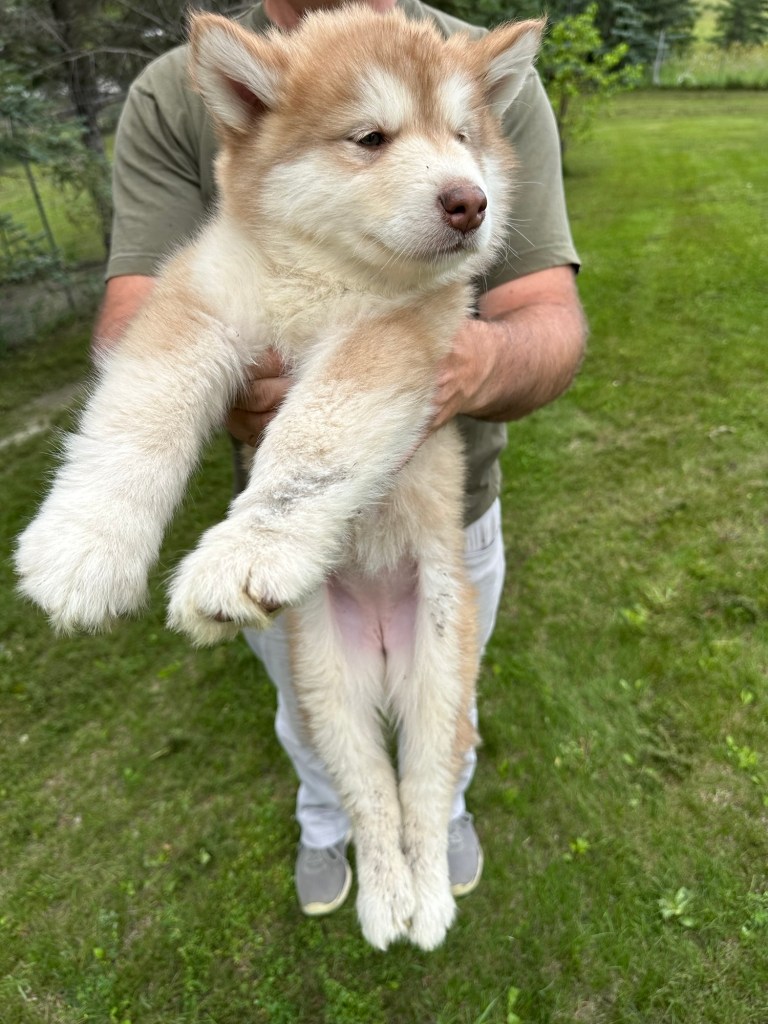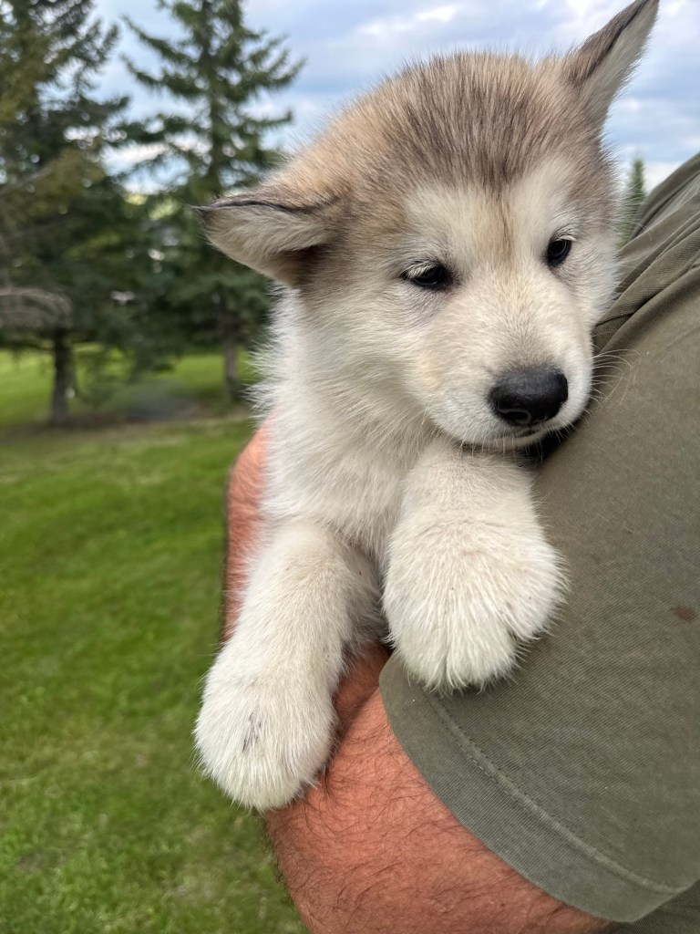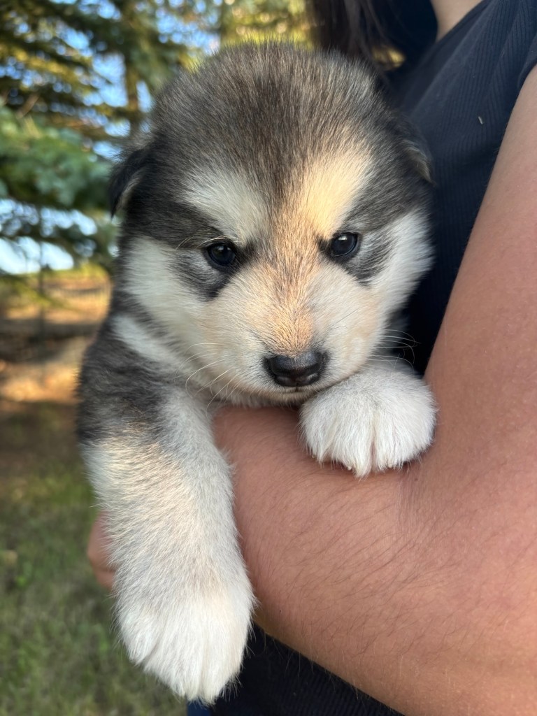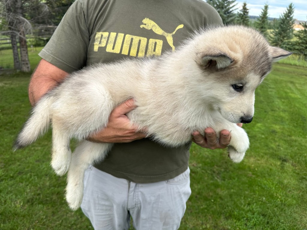 It’s been quite wet and rainy in Calgary so our latest batch of growth photos was slightly delayed. Our Alaskan Malamute puppies are now 5.5 weeks old, and they’re full of life! At this stage, they’re becoming more independent, engaging in play, exploring their environment, and interacting more with people. Their unique personalities are really shining through and they are so much fun to watch and play with! With one selection still pending there are only two puppies remaining from this litter. If you’d like to bring one home contact us today!