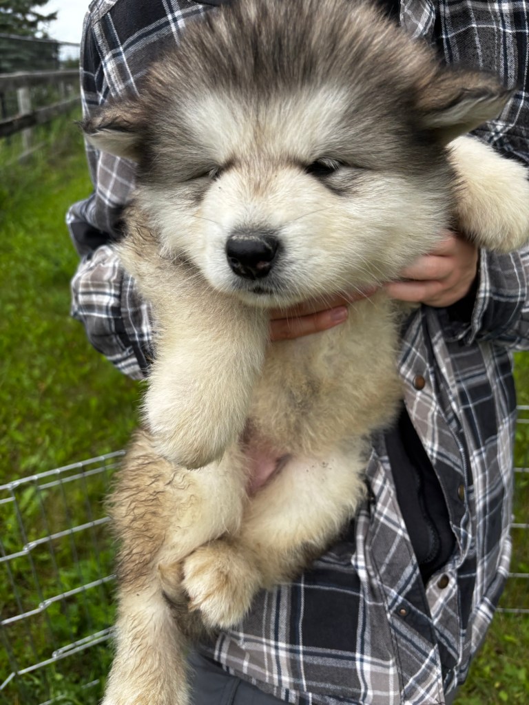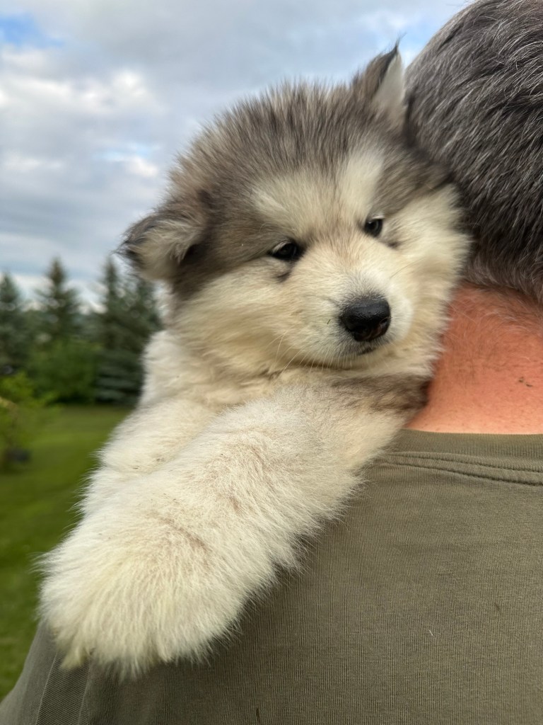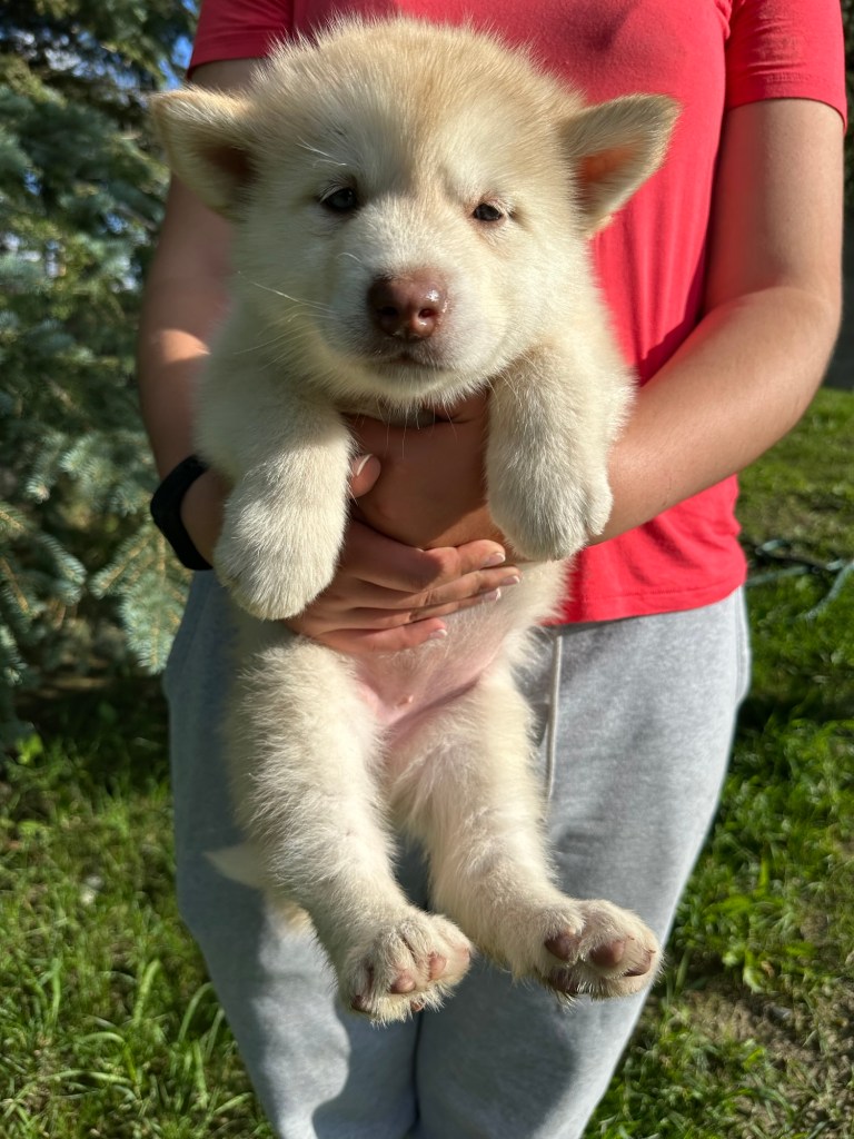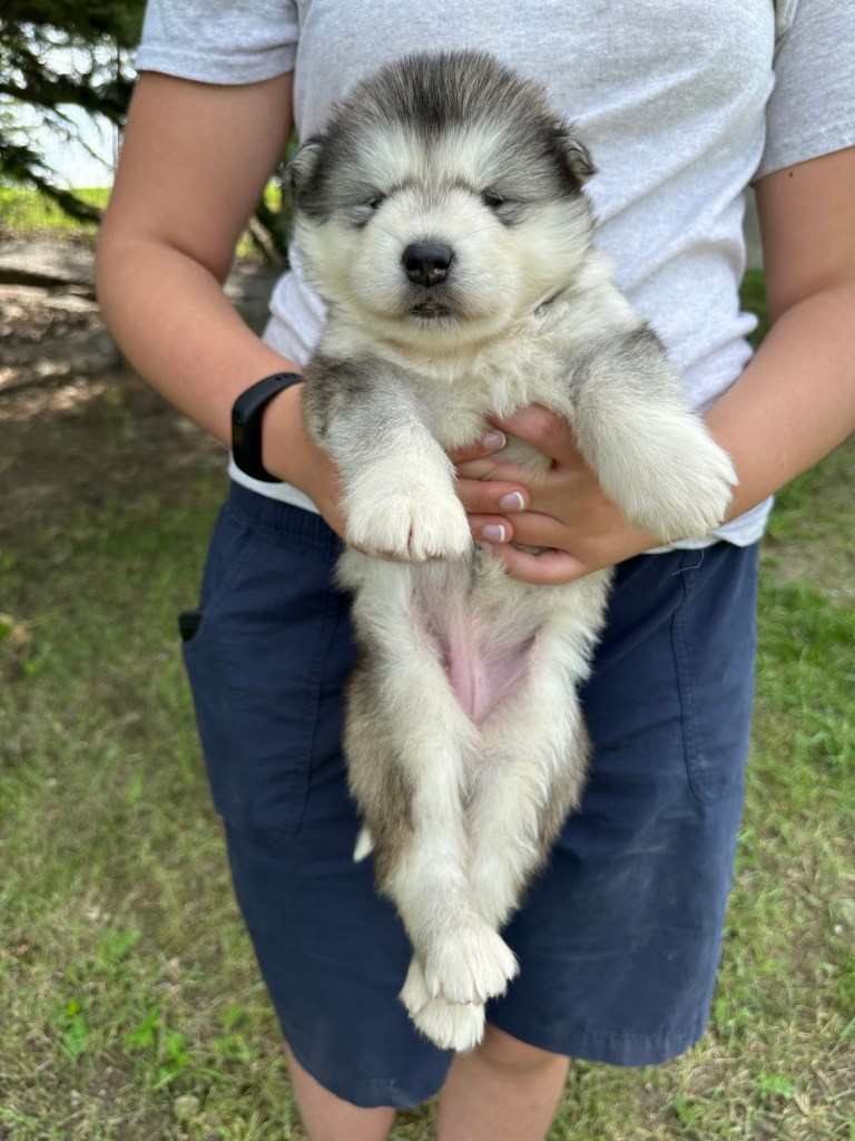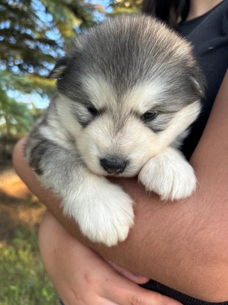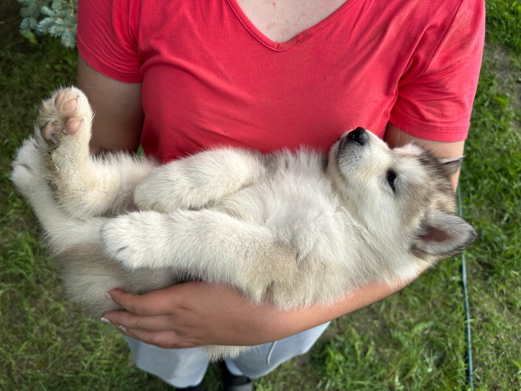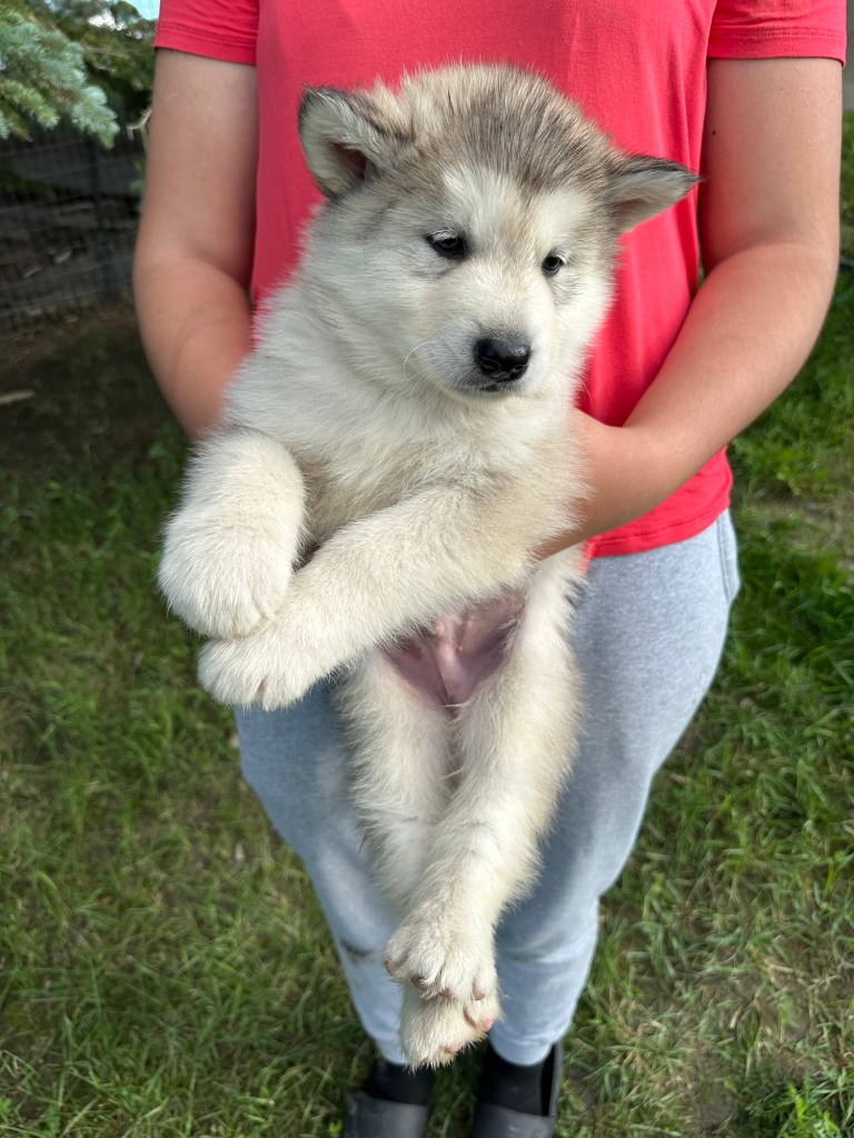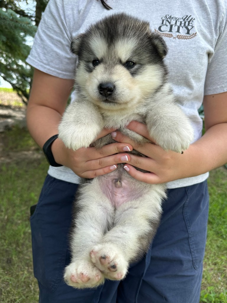 It’s been quite wet and rainy in Calgary so our latest batch of growth photos was slightly delayed. Our Alaskan Malamute puppies are now 5.5 weeks old, and they’re full of life! At this stage, they’re becoming more independent, engaging in play, exploring their environment, and interacting more with people. Their unique personalities are really shining through and they are so much fun to watch and play with! With one selection still pending there are only two puppies remaining from this litter. If you’d like to bring one home contact us today!