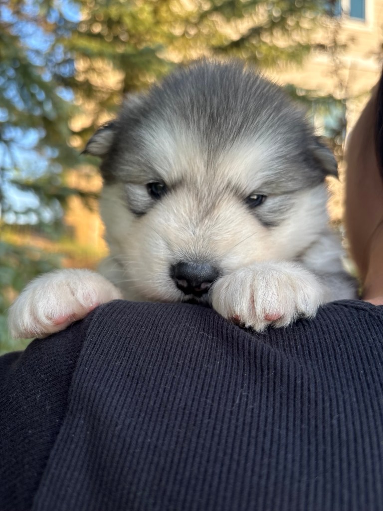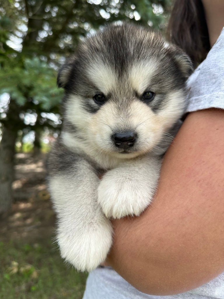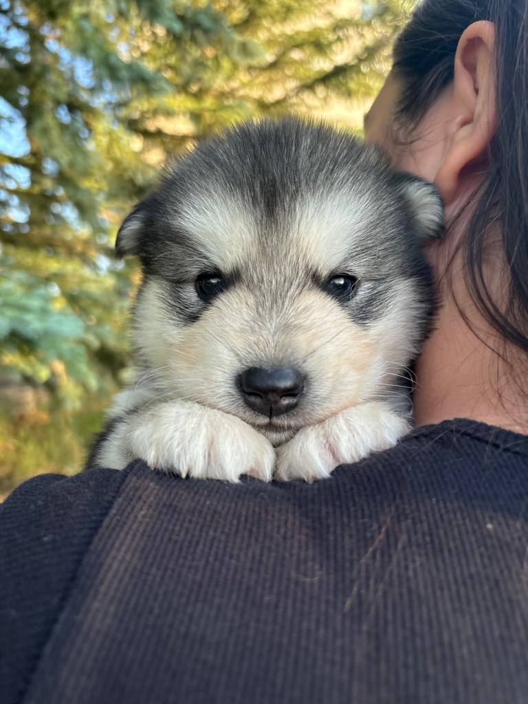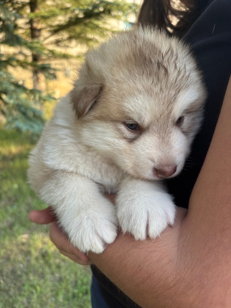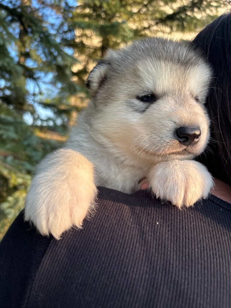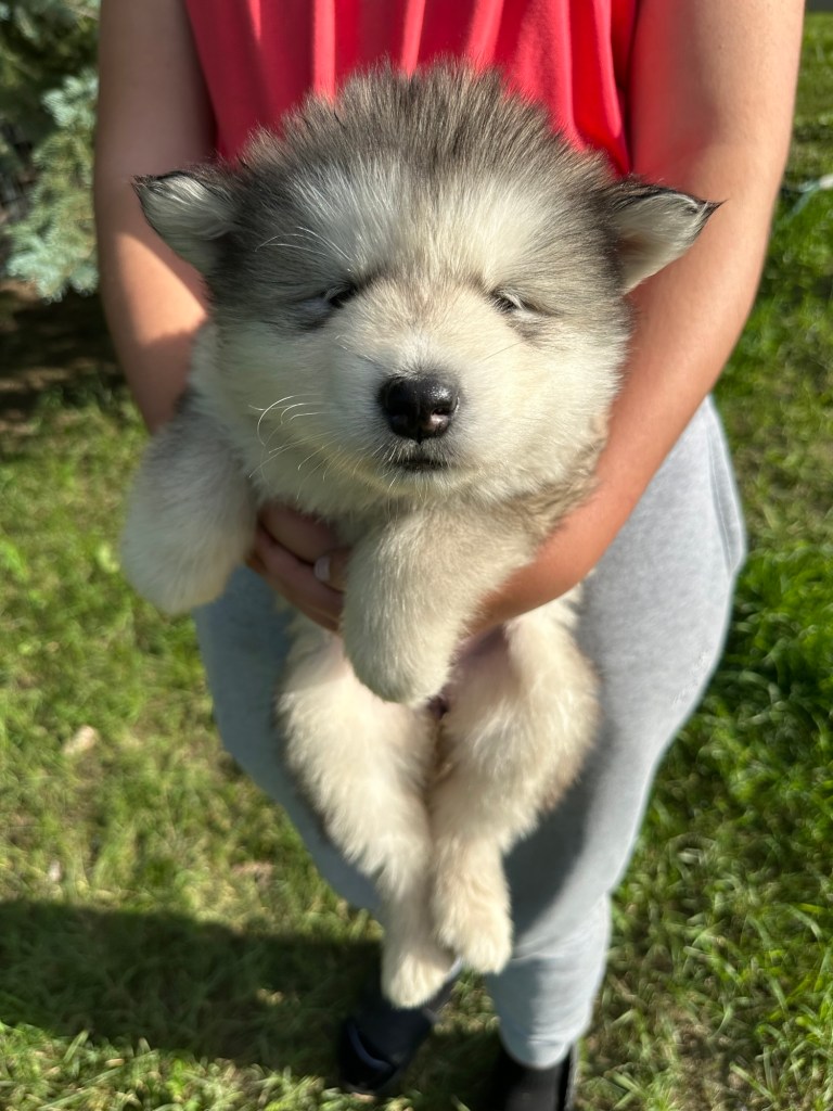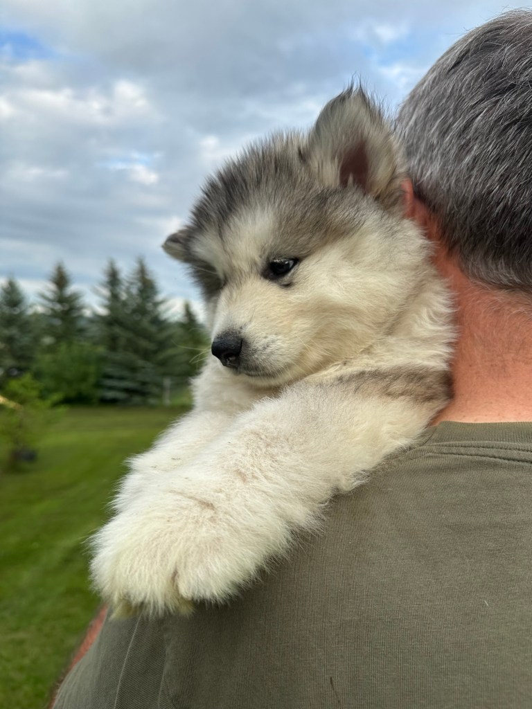 It’s been quite wet and rainy in Calgary so our latest batch of growth photos was slightly delayed. Our Alaskan Malamute puppies are now 5.5 weeks old, and they’re full of life! At this stage, they’re becoming more independent, engaging in play, exploring their environment, and interacting more with people. Their unique personalities are really shining through and they are so much fun to watch and play with! With one selection still pending there are only two puppies remaining from this litter. If you’d like to bring one home contact us today!