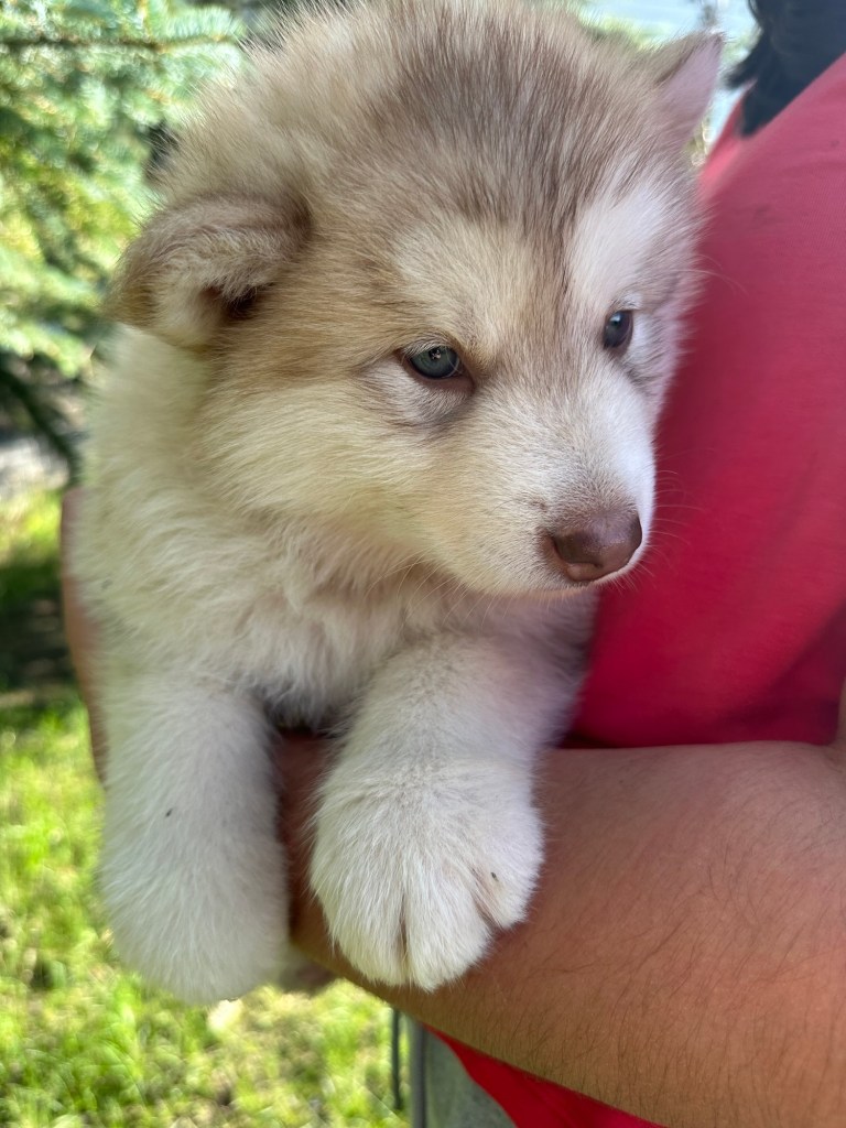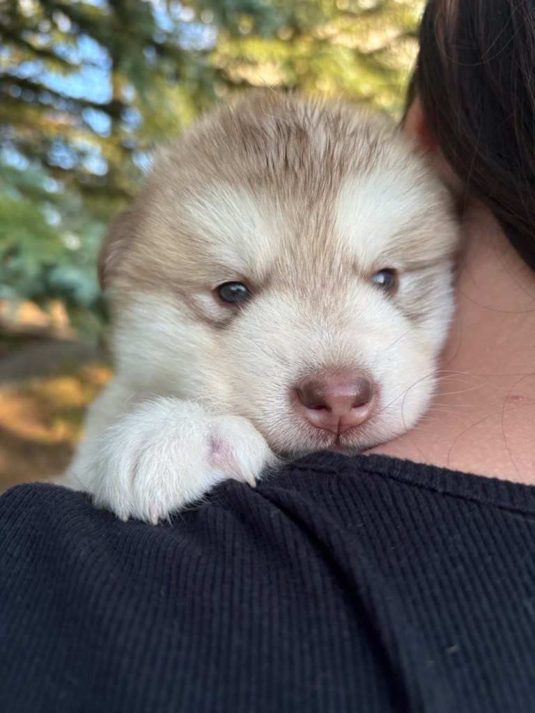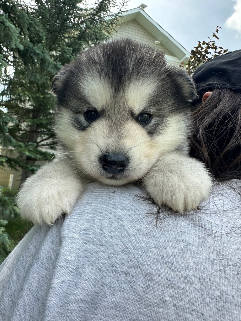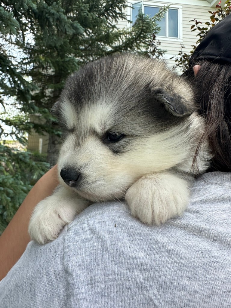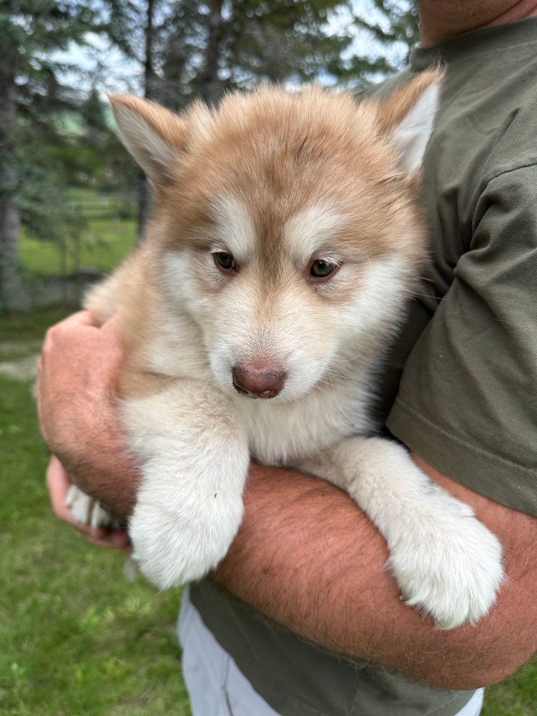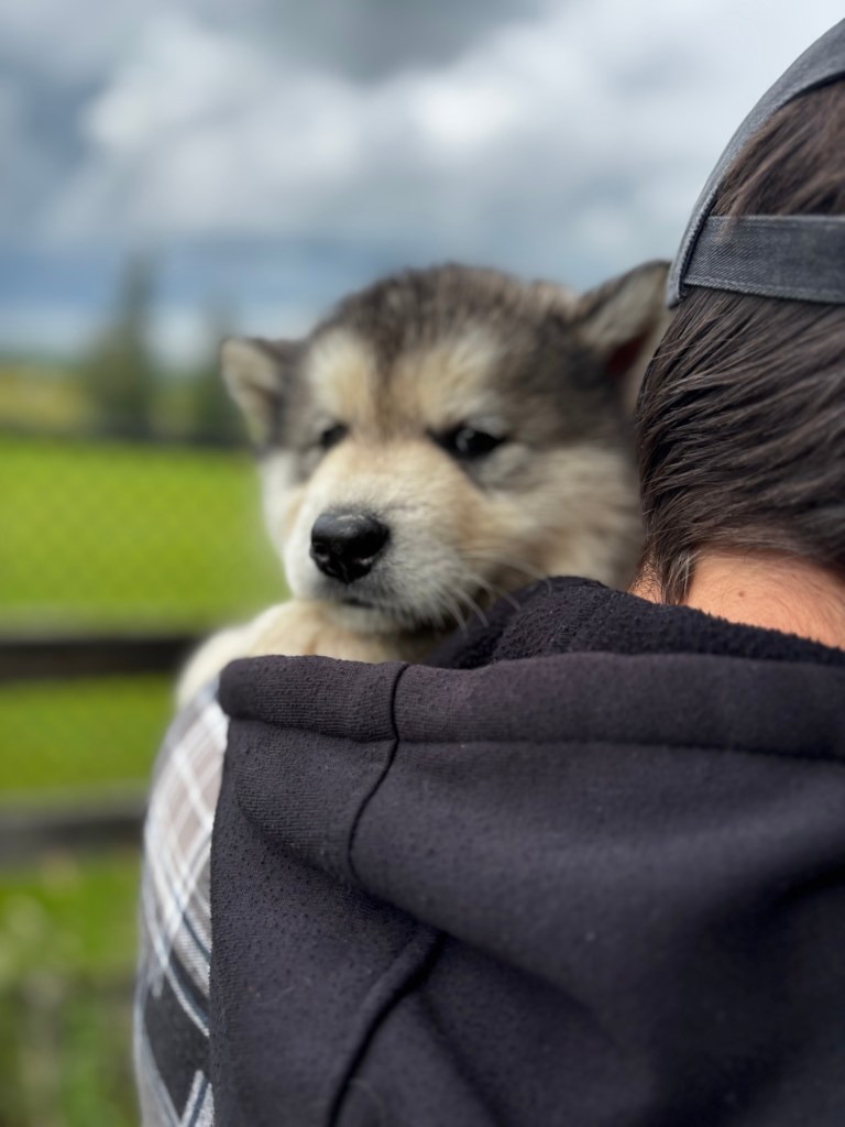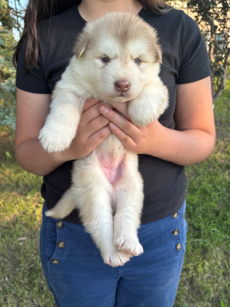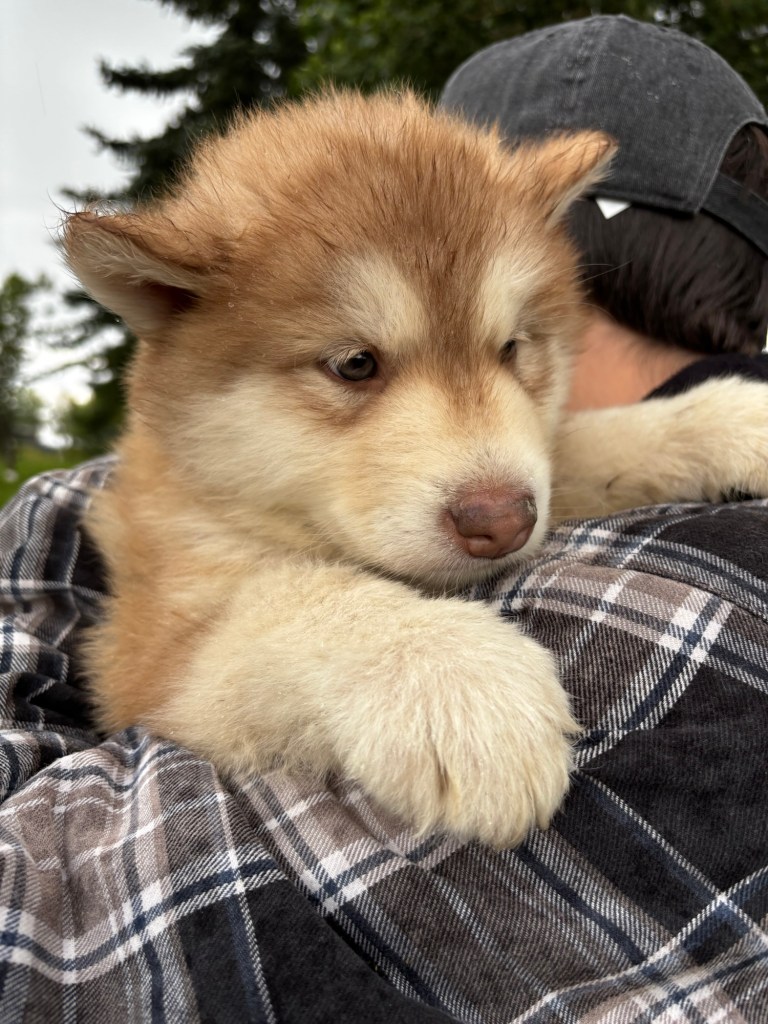 It’s been quite wet and rainy in Calgary so our latest batch of growth photos was slightly delayed. Our Alaskan Malamute puppies are now 5.5 weeks old, and they’re full of life! At this stage, they’re becoming more independent, engaging in play, exploring their environment, and interacting more with people. Their unique personalities are really shining through and they are so much fun to watch and play with! With one selection still pending there are only two puppies remaining from this litter. If you’d like to bring one home contact us today!